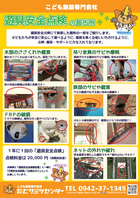 ・遊具安全点検報告書にて、危険個所等をお伝えしています。