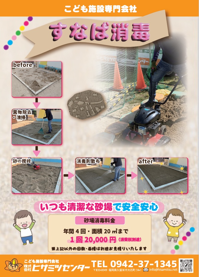 すなば消毒~いつも清潔な砂場で安全安心♪ 2025 11/18 チラシ 定期的に、砂場の消毒にお伺いいたします。 埋まっている異物やおもちゃ、葉っぱや動物の糞などを丁寧に取り除いたあと 砂の撹拌と消毒で、ふかふかの砂場に仕上げます。 チラシ こども園 保育園 安全対策 幼稚園 砂場 この他のチラシ・関連記事 トイレ改修~使いやすく見守りやすい 遊具安全点検プラス・点検報告例 砂場にカーポートパーゴラで暑さ対策 ヒサミツセンター自慢の遊具修繕3選!SFR 遊具安全点検アンケート結果 セーフティーマット FRP遊具の修繕 安全安心♪足元対策!