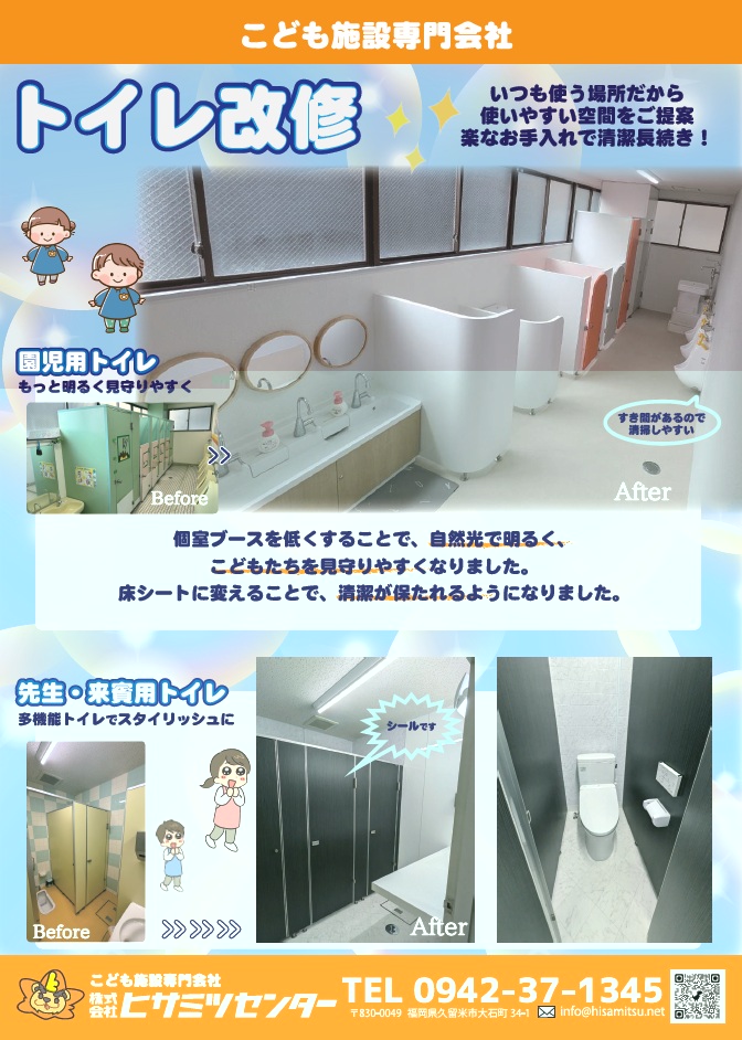 トイレ改修~使いやすく見守りやすい 2025 11/18 チラシ 園児用トイレは明るく、子どもたちが使いやすい&子どもたちを見守りやすい空間になりました。 先生方のお掃除が楽になるよう、床シートへ変更し、配置も考慮しました。 先生方や来賓用トイレは、すっきりスタイリッシュに仕上げています。 チラシ こども園 トイレ改修 保育園 幼稚園 この他のチラシ・関連記事 すなば消毒~いつも清潔な砂場で安全安心♪ 遊具安全点検プラス・点検報告例 砂場にカーポートパーゴラで暑さ対策 ヒサミツセンター自慢の遊具修繕3選!SFR 遊具安全点検アンケート結果 セーフティーマット FRP遊具の修繕 安全安心♪足元対策!