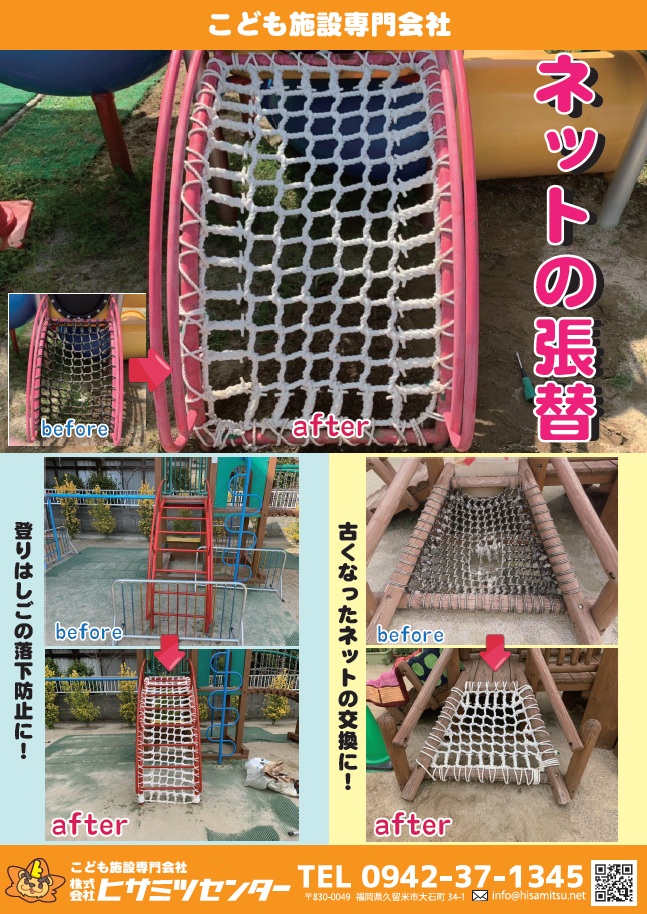 ネットの張り替え、新設!~安全安心な遊具へ 2026 1/06 チラシ 遊具のネット部分に、破れや擦り切れはありませんか? 子どもたちが元気いっぱい安全にあそべるように、安全基準に適した太さ&網目のネットに交換します。 また、階段や吊り橋などに、落下防止ネットの取り付けも行っております。 チラシ こども園 保育園 安全対策 幼稚園 遊具 遊具修繕 この他のチラシ・関連記事 サッカーゴール ネットのほつれや破れ、フレームにサビはありませんか? ステンレス製のすべり面にsHiコート塗装 遊具の移設・撤去で広くて安全な園庭へ 遊具安全点検のご案内 トイレ改修~使いやすく見守りやすい すなば消毒~いつも清潔な砂場で安全安心♪ 遊具安全点検プラス・点検報告例 砂場にカーポートパーゴラで暑さ対策