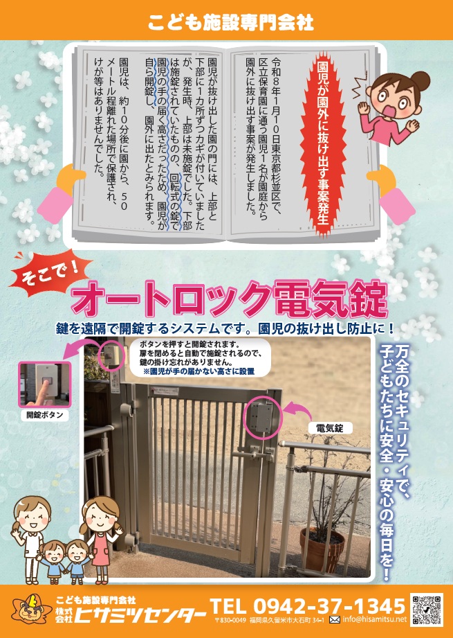 開錠ボタンは、園児が届かない高さに設置するので子どもたちの抜け出しを防止できます。