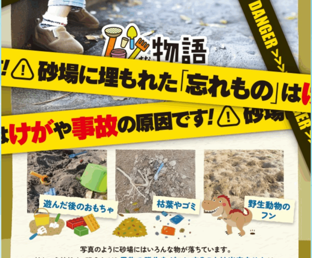 砂場に埋もれた『忘れもの』は、けがや事故の原因です!