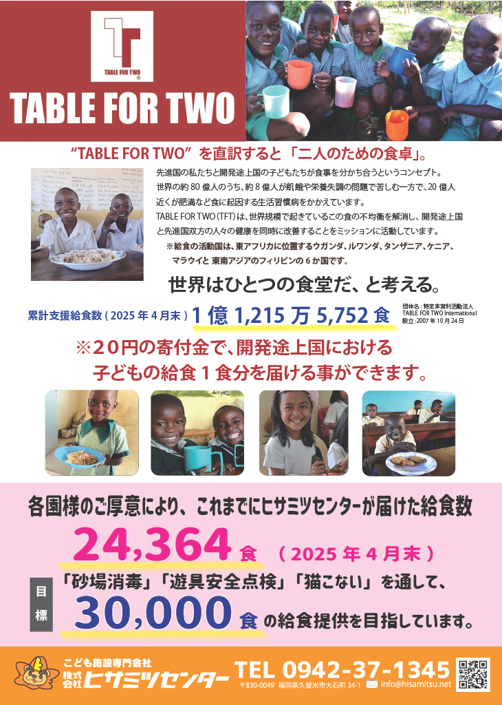 株式会社ヒサミツセンターでは「砂場消毒」「遊具安全点検」「猫こない」の売上の一部をTABLE FOR TWOのプログラムを通じて、世界の開発途上国の子ども達に学校給食をお届けする活動を行っています